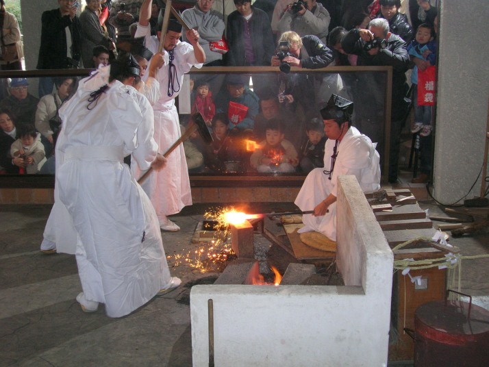 | 正月2日関鍛冶伝承館にて、関在住の刀匠達による、刀の 「打ち初め式」が古式に則り行われました。 関の刃物の原点となる刀作りは、750年の伝統に支えられ ています。 マスコミを含め多くの見物人でにぎわいます |
